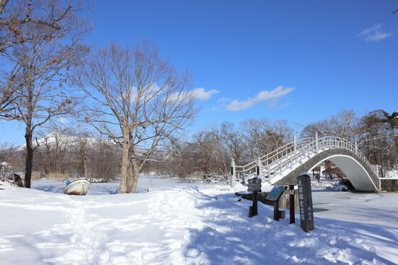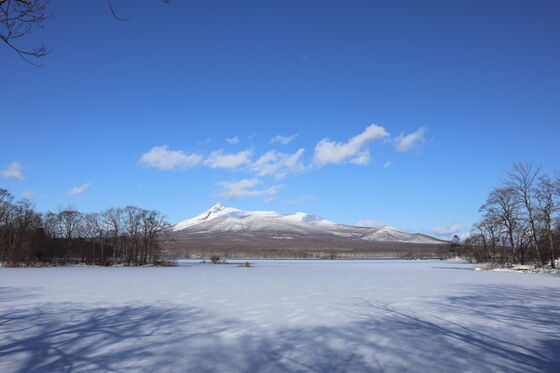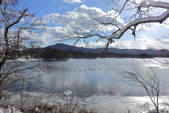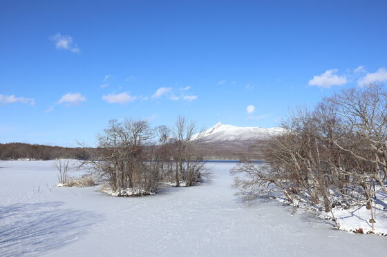 湖面のほとんどに氷が張り真っ白になった大沼と駒ケ岳です