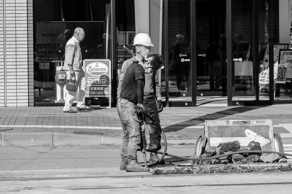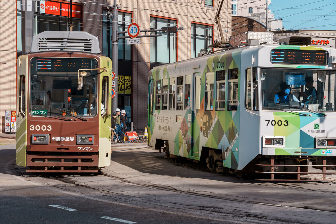 交差点近くでは市電の軌道工事中