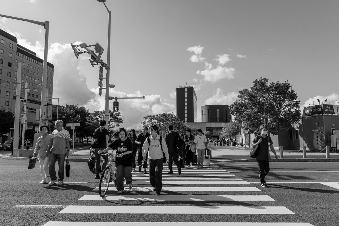 駅前交差点を渡る