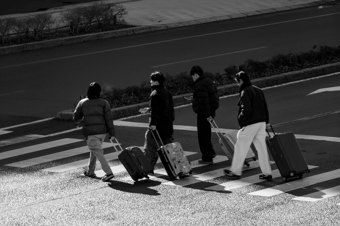 横断歩道を渡りながら市電を撮る